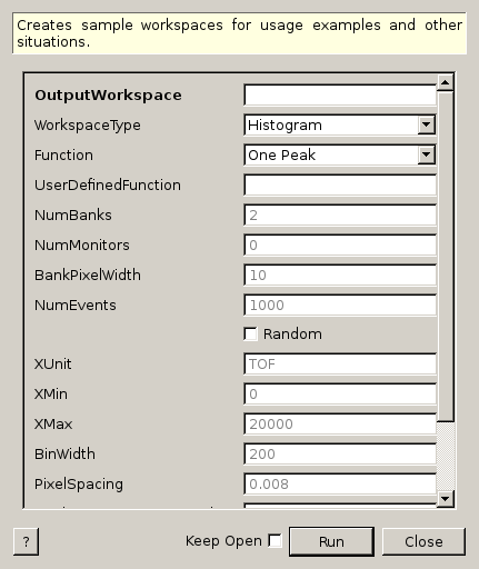 | Function | Input | string | One Peak | Preset options of the data to fill the workspace with. Allowed values: [‘Exp Decay’, ‘Flat background’, ‘Multiple Peaks’, ‘One Peak’, ‘Powder Diffraction’, ‘Quasielastic’, ‘Quasielastic Tunnelling’, ‘User Defined’] |