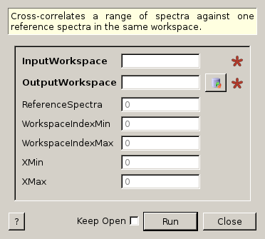 | WorkspaceIndexMin | Input | number | 0 | The workspace index of the first member of the range of spectra to cross-correlate against. |