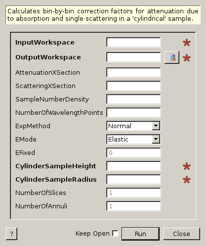 | AttenuationXSection | Input | number | Optional | The ABSORPTION cross-section, at 1.8 Angstroms, for the sample material in barns. Column 8 of a table generated from http://www.ncnr.nist.gov/resources/n-lengths/. |