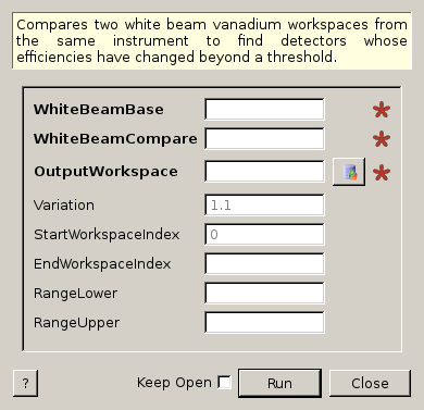 | WhiteBeamCompare | Input | MatrixWorkspace | Mandatory | Name of a matching second white beam vanadium run from the same instrument |