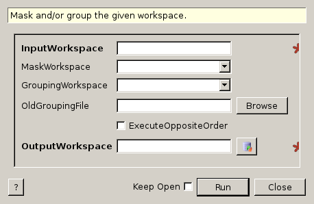 | InputWorkspace | Input | MatrixWorkspace | Mandatory | An input workspace to mask and group. |