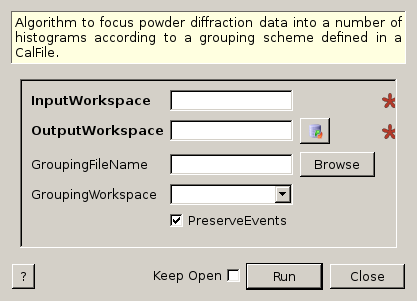 | OutputWorkspace | Output | MatrixWorkspace | Mandatory | The result of diffraction focussing of InputWorkspace |