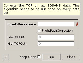 | InputWorkspace | Input | EventWorkspace | Mandatory | Workspace to apply the TOF correction to |