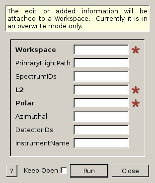 | Workspace | InOut | MatrixWorkspace | Mandatory | Workspace to edit the detector information |