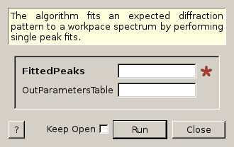 | FittedPeaks | Input | TableWorkspace | Mandatory | Information on fitted peaks, in the format produced by EnggFitPeaks. The table must contain, for every peak fitted the expected peak value (in d-spacing), and the parameters fitted. The expected values are given in the column labelled ‘dSpacing’. When using the back-to-back exponential peak function, the ‘X0’ column must have the fitted peak center. |