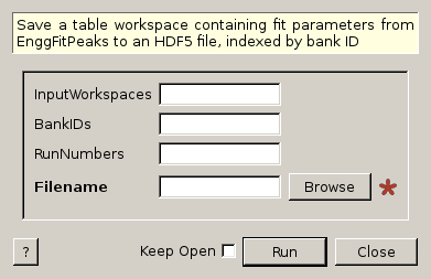 Exports the results of an EnggFitPeaks fit to an HDF5 file indexed by bank ID. If multiple sets of fit results are provided, then the file is divided into sub-groups for each run number, with the Run Number groups indexed further by bank ID. The results go in a sub-group of the Bank group called Single Peak Fitting. This group contains one dataset, which is a table of the fit parameters for every peak