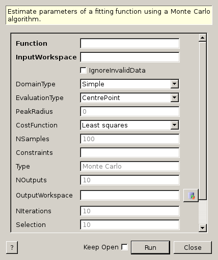 | NOutputs | Input | number | 10 | Number of parameter sets to output to OutputWorkspace. Unused if OutputWorkspace isn’t set. (Monte Carlo only) |