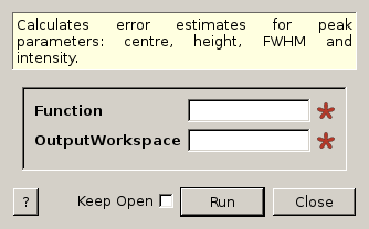 This algorithm takes a function after it has been optimized by the Fit algorithm and calculates peak parameter and associated errors for all peaks in this function. The peak parameters are its centre, height, FWHM and intensity. The output workspace is a table with three columns: parameter name, parameter value and parameter error.
