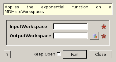 | InputWorkspace | Input | IMDWorkspace | Mandatory | A MDEventWorkspace or MDHistoWorkspace on which to apply the operation. |