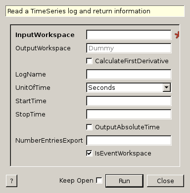 | OutputWorkspace | Output | MatrixWorkspace | Dummy | Name of the workspace containing the log events in Export. |