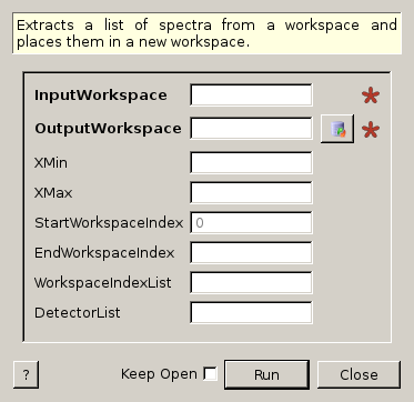 | WorkspaceIndexList | Input | unsigned int list | A comma-separated list of individual workspace indices to read. Only used if explicitly set. The WorkspaceIndexList is only used if the DetectorList is empty. | |