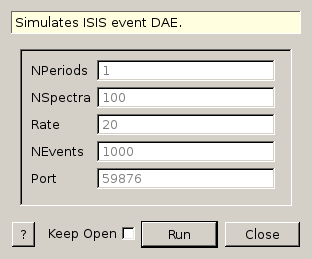 Simulates ISIS event DAE. It runs continuously until canceled and listens to port 10000 for connection. When connected starts sending event packets.