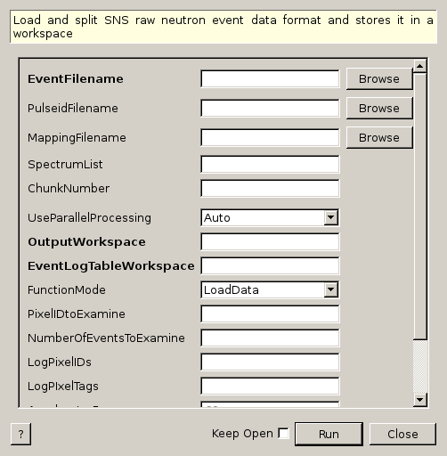 | EventLogTableWorkspace | Output | TableWorkspace | Mandatory | Optional output table workspace containing the event log (pixel) information. |