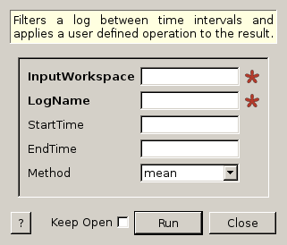 Filters out logs that do not sit between StartTime and EndTime. The algorithm also applied a ‘Method’ to those filtered results and returns the statistic. A workspace must be provided containing logs. The log name provided must refer to a FloatTimeSeries log.