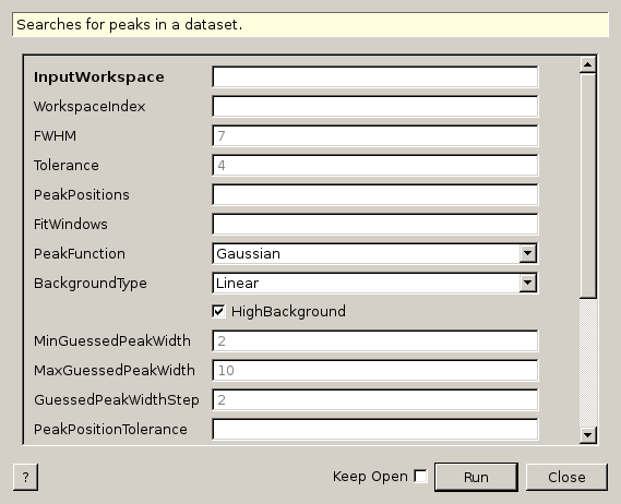 | InputWorkspace | Input | MatrixWorkspace | Mandatory | Name of the workspace to search |