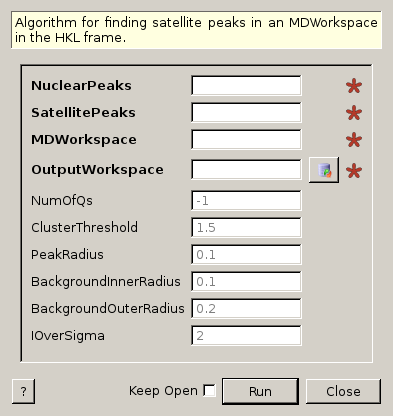 | SatellitePeaks | Input | PeaksWorkspace | Mandatory | Positions of seed satellite peaks. These will be used to define the modulation (q) vectors for each satellite. |