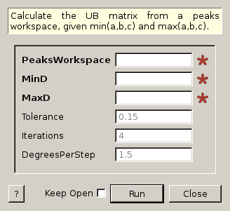 A UB matrix is formed using these three vectors and the resulting UB matrix is again optimized using a least squares method. Finally, starting from this matrix, a matrix corresponding to the Niggli reduced cell is calculated and returned as the UB matrix. If the specified peaks are accurate and belong to a single crystal, this method should produce the UB matrix corresponding to the Niggli reduced cell. However, other software will usually be needed to adjust this UB to match a desired conventional cell. While this algorithm will occasionally work for as few as four peaks, it works quite consistently with at least ten peaks, and in general works best with a larger number of peaks.