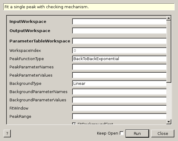 | FitBackgroundFirst | Input | boolean | True | If true, then the algorithm will fit background first. And then the peak. |