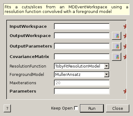 | ResolutionFunction | Input | string | Mandatory | The name of a resolution model. Allowed values: [‘TobyFitResolutionModel’] |