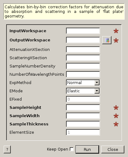 Calculates bin-by-bin correction factors for attenuation due to absorption and scattering in a sample of ‘flat plate’ geometry.