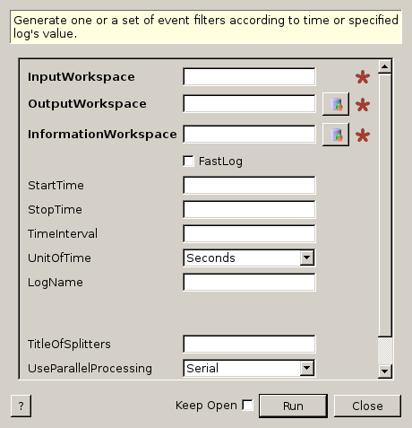 | OutputWorkspace | Output | Workspace | Mandatory | The name to use for the output SplittersWorkspace object, i.e., the filter. |