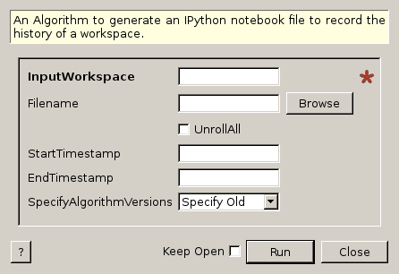 | Filename | Input | string | The name of the file into which the workspace history will be generated. Allowed extensions: [‘.ipynb’] | |