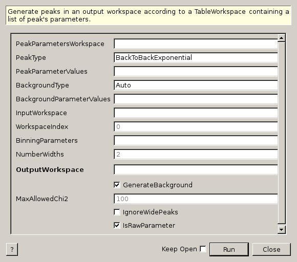 | PeakParametersWorkspace | Input | TableWorkspace | Input TableWorkspace for peak’s parameters. | |