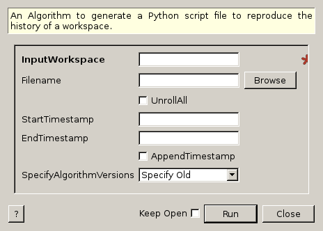 | Filename | Input | string | The name of the file into which the workspace history will be generated. Allowed extensions: [‘.py’] | |
