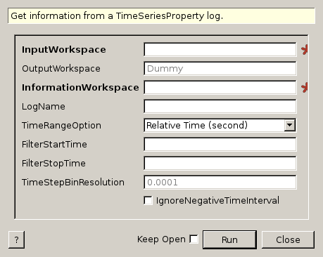 | InformationWorkspace | Output | TableWorkspace | Name of optional log statistic information output Tableworkspace. | |