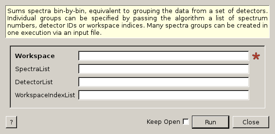 Sums spectra bin-by-bin, equivalent to grouping the data from a set of detectors. Individual groups can be specified by passing the algorithm a list of spectrum numbers, detector IDs or workspace indices. Many spectra groups can be created in one execution via an input file.