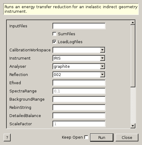 | Instrument | Input | string | Mandatory | Instrument used during run. Allowed values: [‘IRIS’, ‘OSIRIS’, ‘TOSCA’, ‘TFXA’] |