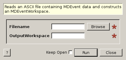 Creates an MDEventWorkspace from a plain ASCII file. Uses a simple format for the file described below. This algorithm is suitable for importing small volumes of data only. This algorithm does not scale well for large input workspaces. The purpose of this algorithm is to allow users to quickly import data from existing applications for purposes of comparison.