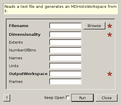 | OutputWorkspace | Output | IMDHistoWorkspace | Mandatory | MDHistoWorkspace reflecting the input text file. |