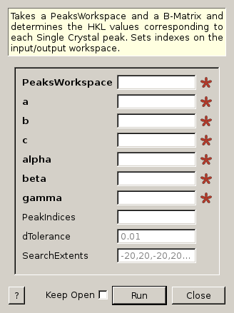 | SearchExtents | Input | int list | -20,20,-20,20,-20,20 | A comma separated list of min, max for each of H, K and L, Specifies the search extents applied for H K L values associated with the peaks. |
