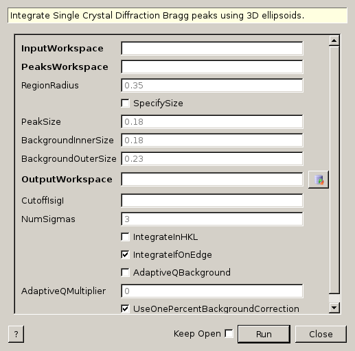 | PeaksWorkspace | InOut | PeaksWorkspace | Mandatory | Workspace with Peaks to be integrated. NOTE: The peaks MUST be indexed with integer HKL values. |