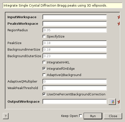 | PeaksWorkspace | InOut | PeaksWorkspace | Mandatory | Workspace with peaks to be integrated |