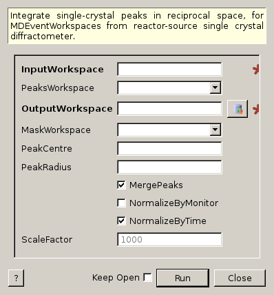 | MergePeaks | Input | boolean | True | In case that there are more than 1 run number in the given PeaksWorkspace and MDEVentWorkspace, if it is set to true, then the peaks’ intensities will be merged. |