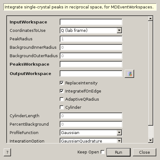 | PeaksWorkspace | Input | PeaksWorkspace | Mandatory | A PeaksWorkspace containing the peaks to integrate. |
