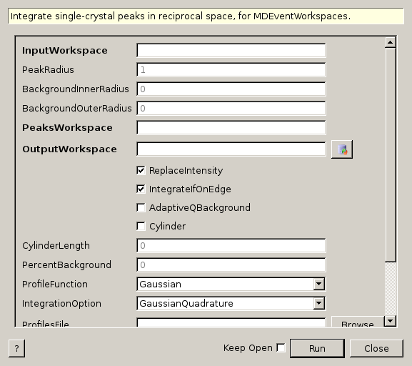 | PeaksWorkspace | Input | PeaksWorkspace | Mandatory | A PeaksWorkspace containing the peaks to integrate. |