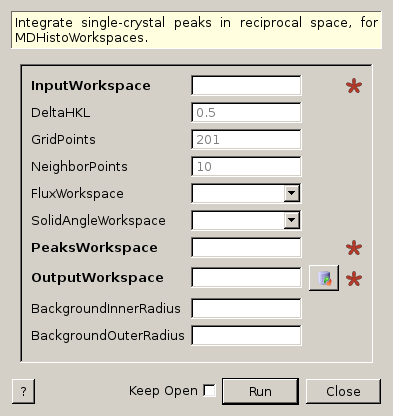 | BackgroundInnerRadius | Input | number | Optional | Optional:Inner radius to use to evaluate the background of the peak. If omitted background is region of HKL box - peak. |