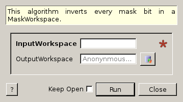 | InputWorkspace | Input | MaskWorkspace | Mandatory | MaskWorkspace to be inverted. |