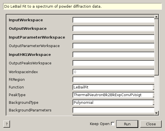 | InputWorkspace | Input | MatrixWorkspace | Mandatory | Input workspace containing the data to fit by LeBail algorithm. |