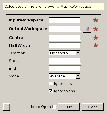 The orientation of the profile is selected by the Direction property. By default, the line runs over the entire workspace. The length can be optionally limited by specifying the Start and/or the End properties. A region over which the profile is calculated is given by HalfWidth. The width is rounded to full bins so that partial bins are included entirely.