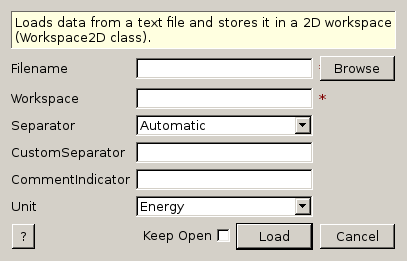The LoadAscii2 algorithm reads in spectra data from a text file and stores it in a Workspace2D as data points. The data in the file must be organized in columns separated by commas, tabs, spaces, colons or semicolons. Only one separator type can be used throughout the file; use the “Separator” property to tell the algorithm which to use. The algorithm SaveAscii2 is normally able to produce such a file.