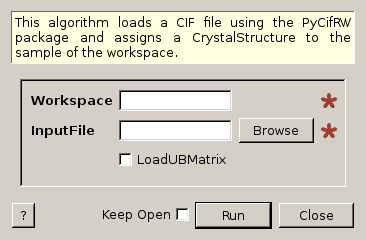 This algorithm loads a CIF file using the PyCifRW package and assigns a CrystalStructure to the sample of the workspace.