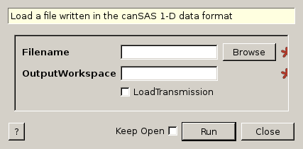 | Filename | Input | string | Mandatory | The name of the CanSAS1D file to load. Allowed extensions: [‘.xml’] |