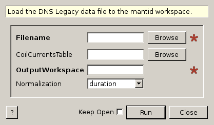 This algorithm loads a DNS legacy data file into a Workspace2D. The loader rotates the detector bank in the position given in the data file.