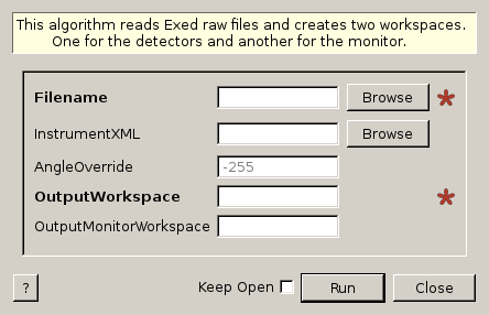 | OutputWorkspace | Output | MatrixWorkspace | Mandatory | Mantid workspace containing the measured data. |
