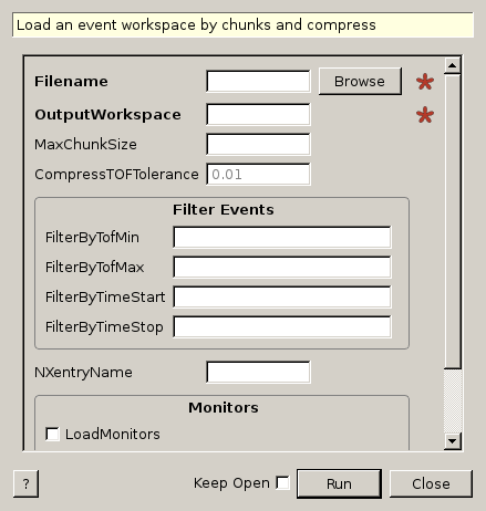 | Filename | Input | string | Mandatory | The name of the Event NeXus file to read, including its full or relative path. The file name is typically of the form INST_####_event.nxs (N.B. case sensitive if running on Linux). Allowed extensions: [‘_event.nxs’, ‘.nxs.h5’, ‘.nxs’] |