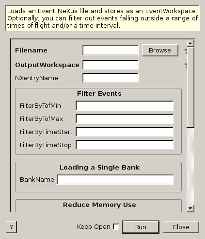 | Filename | Input | string | Mandatory | The name of the Event NeXus file to read, including its full or relative path. The file name is typically of the form INST_####_event.nxs (N.B. case sensitive if running on Linux). Allowed extensions: [‘_event.nxs’, ‘.nxs.h5’, ‘.nxs’] |